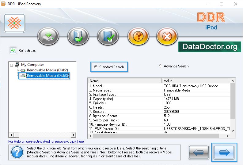 1.Standard SearchSelect iPod disk drive or partition from left panel and then select the “Standard Search” option. Click on Next button to proceed.