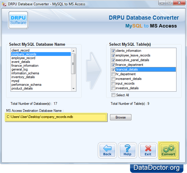 Select MySQL Database Name, MySQL Table(s) and enter MS Access Destination Database Name and click on 'Convert' button.