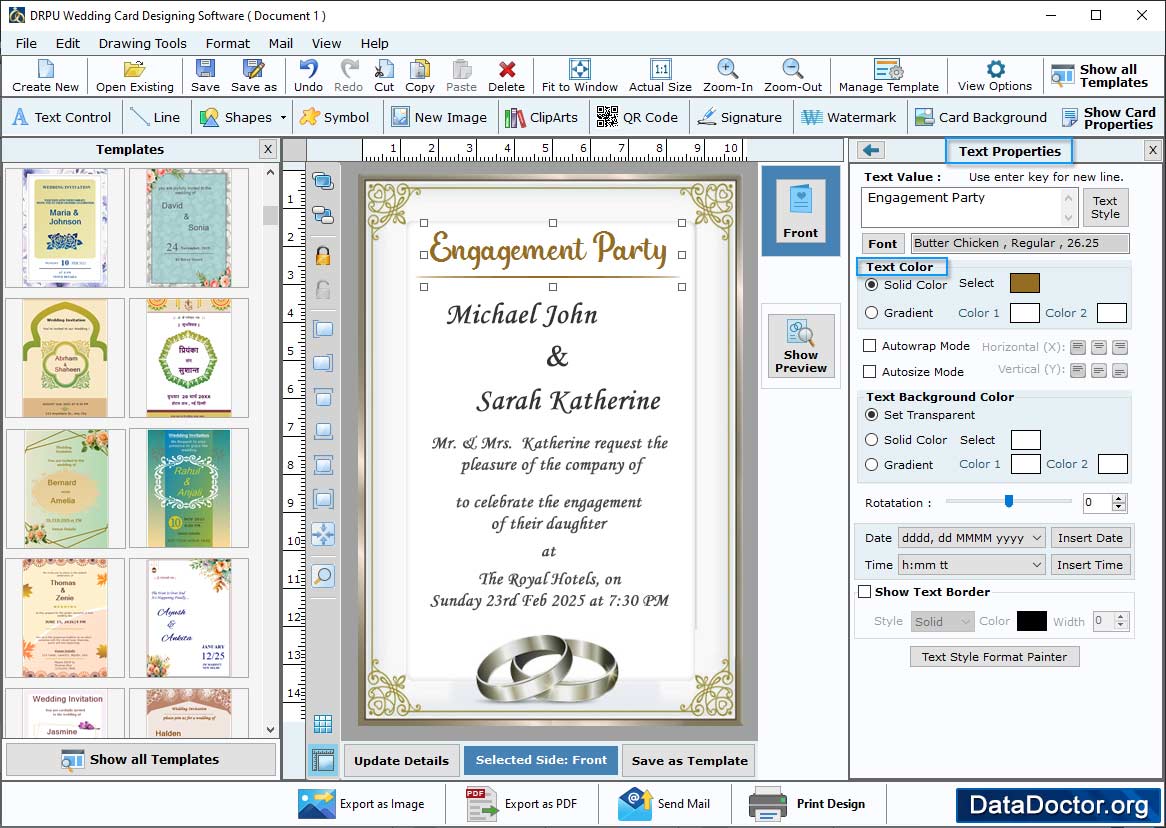 Wedding Cards Maker Software creates multiple wedding invitation cards simultaneously using batch processing series option. Wedding card making program allows you to add background, style, shapes, images and other objects on card. You can send designed invitation cards to the user specified email address by using inbuilt email settings. Wedding Card Creator Software allows you to insert images on wedding invitation card from image library.